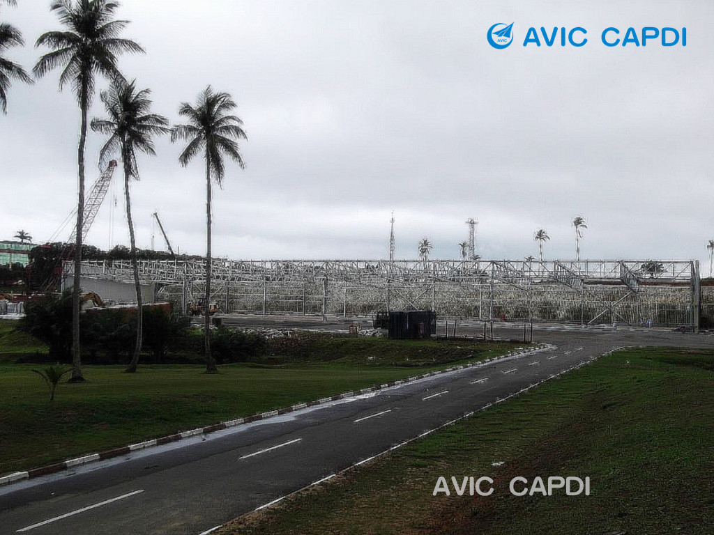 Сведения о проекте: Покрытие ангара установлена система сборной плоской стальной фермы. Опорная система установлена с помощью стальных колонн. Ворота оборудована нержавеющая стальная самоскладная. И одновременно предназначен для размещения внутри среднего вертолёта разных тип.